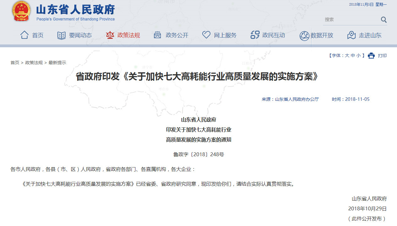 近日山東省人民政府印發(fā)《關(guān)于加快七大高耗能行業(yè)高質(zhì)量發(fā)展的實施方案的通知》,